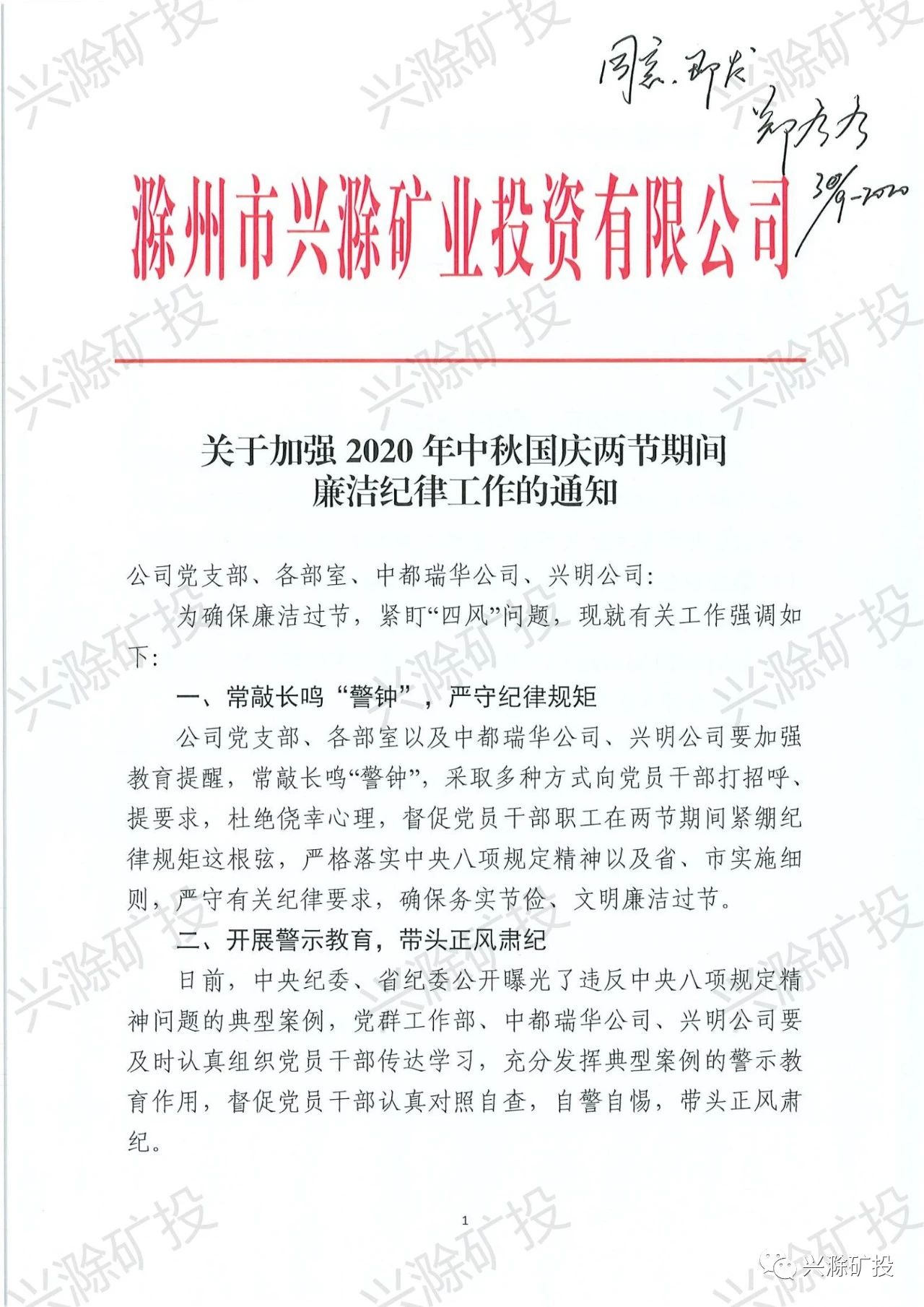 市礦投公司關(guān)于加強(qiáng)2020年中秋國(guó)慶兩節(jié)期間廉潔紀(jì)律工作的通知